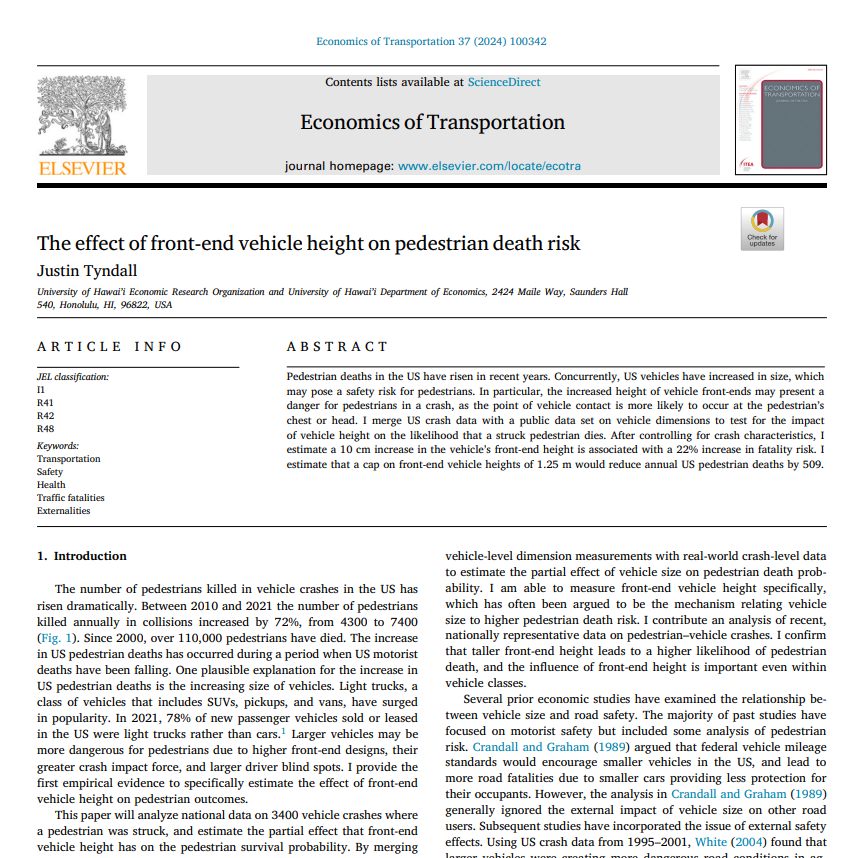 Tyndall, Justin. (2024). The effect of front-end vehicle height on pedestrian death risk. Economics of Transportation, 37. doi.org/10.1016/j.ecotra.2024.100342. Online source 100342https://www.sciencedirect.com/science/article/pii/S2212012224000017